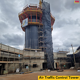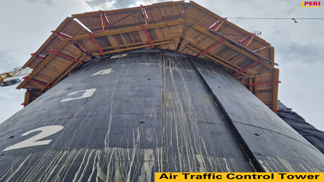 View looking up at the curved concrete wall of the air traffic control tower in Accra. The VARIO and CB240 climbing systems provided precise alignment and safe access at each lift during construction.