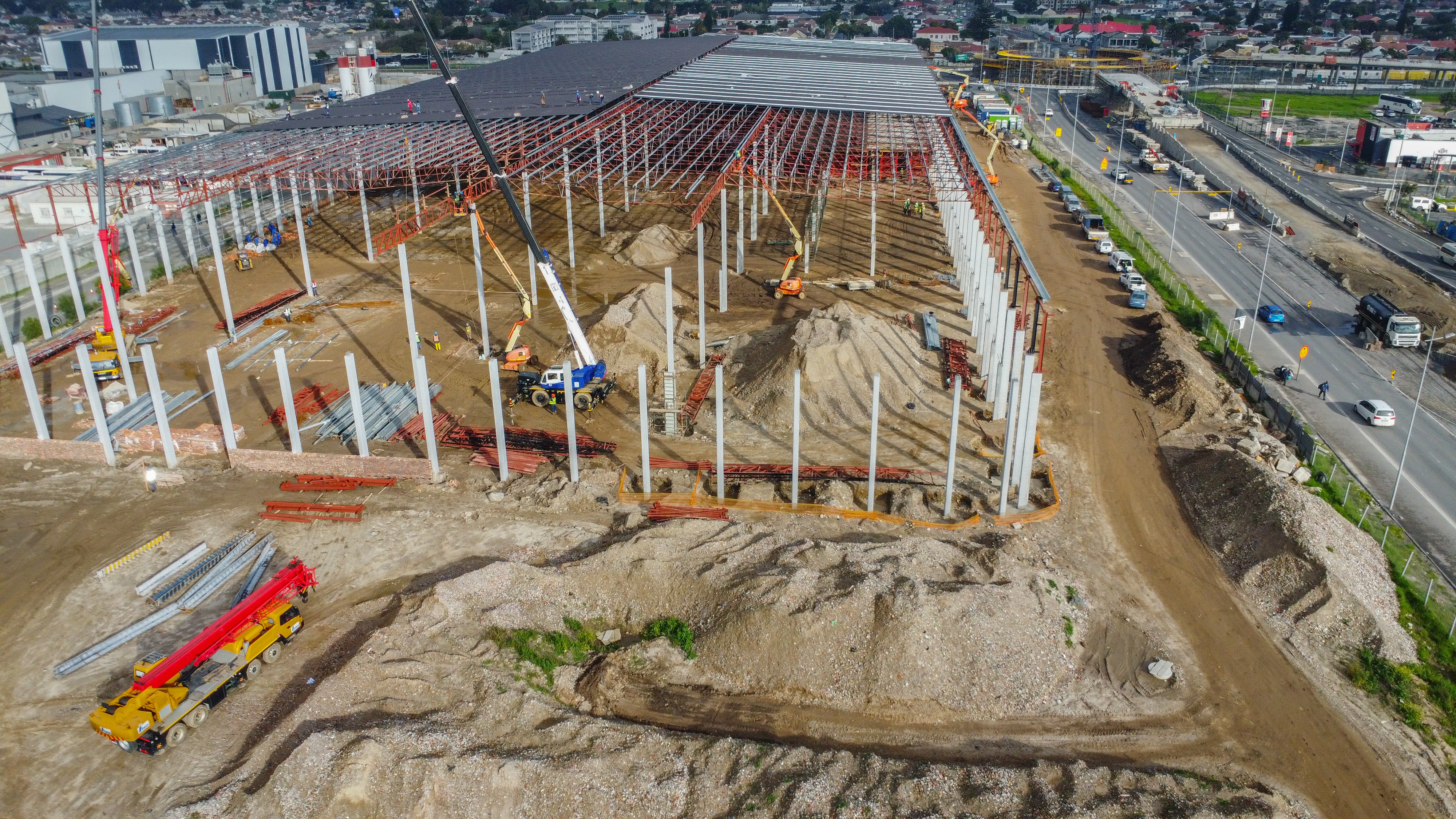 Aerial view showing the full warehouse structure under construction in Ottery. PD5 towers and slab formwork visible across multiple bays under the expanding roof.
